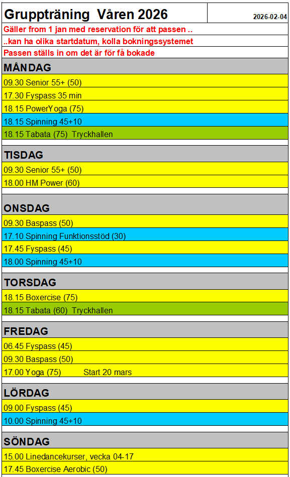 Se schema för våra gruppträningspass: Gruppträning Våren 2026