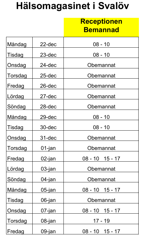 Begränsad bemanning i receptionen. Vi önskar er alla en God Jul och ett Gott Nytt År :-) 2025-12-19 i Allmänt Prenumerera på nyheter Genom att prenumerera på nyheter kommer du att få ett e-postmeddelande varje gång Hälsomagasinet i Svalöv publicerar en nyhet. Ange din e-postadress: Genom att klicka på "Prenumerera" godkänner du vår integritetspolicy. Avbryt Prenumerera Du prenumererar nu på nyheter från Hälsomagasinet i Svalöv. Vi har skickat ett bekräftelsemail till . Stäng Prenumerera via: E-post RSS Klicka här